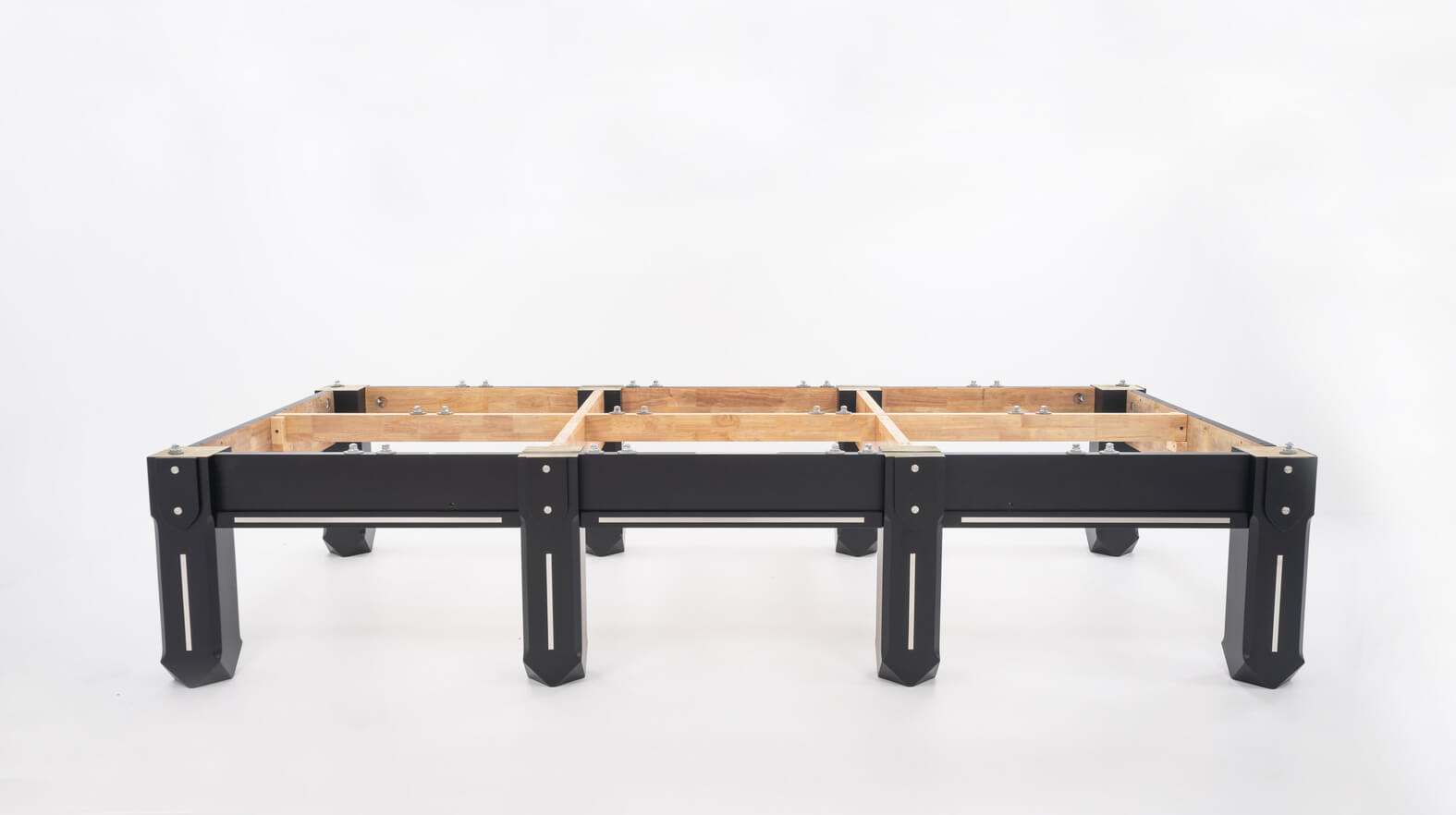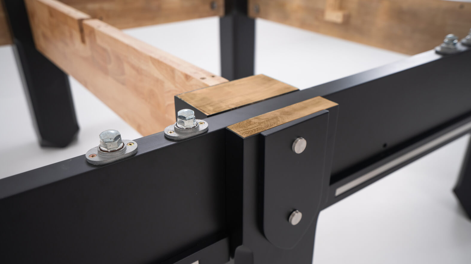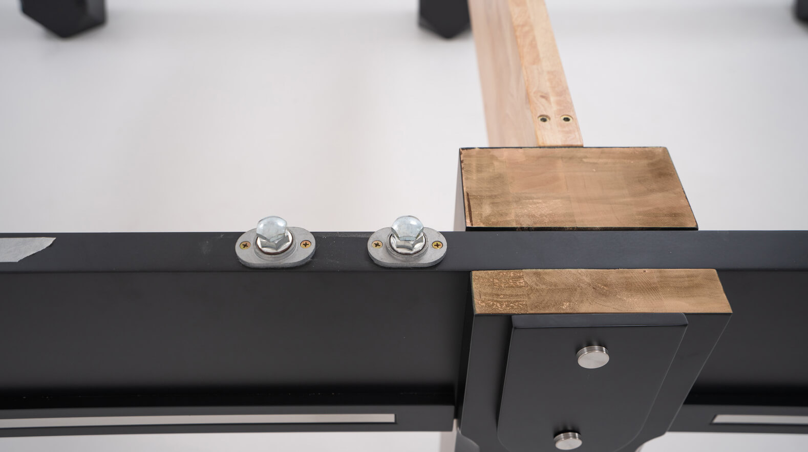8 болтов для точной настройки равномерно распределены по каркасу из тайского каучукового дерева толщиной 40 мм и раме, остальные 4 распределены на каждой боковой ножке, а 2 распределены в середине. Это необходимо для того, чтобы каждая плита равномерно поддерживалась 6 болтами, которые помогают не только быстро регулировать уровень, но и делают бильярд более устойчивым.