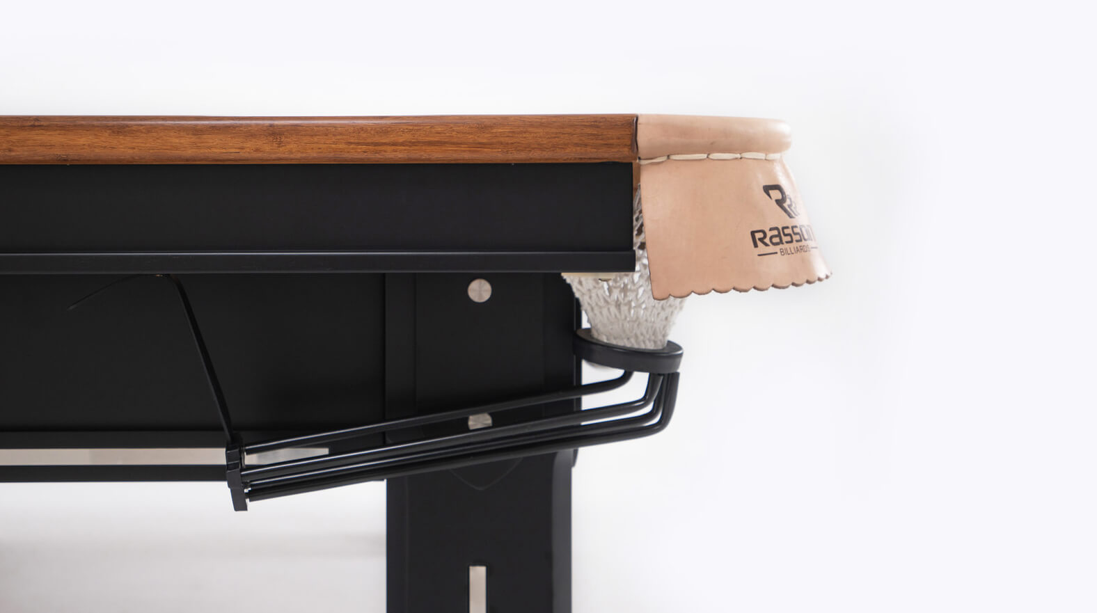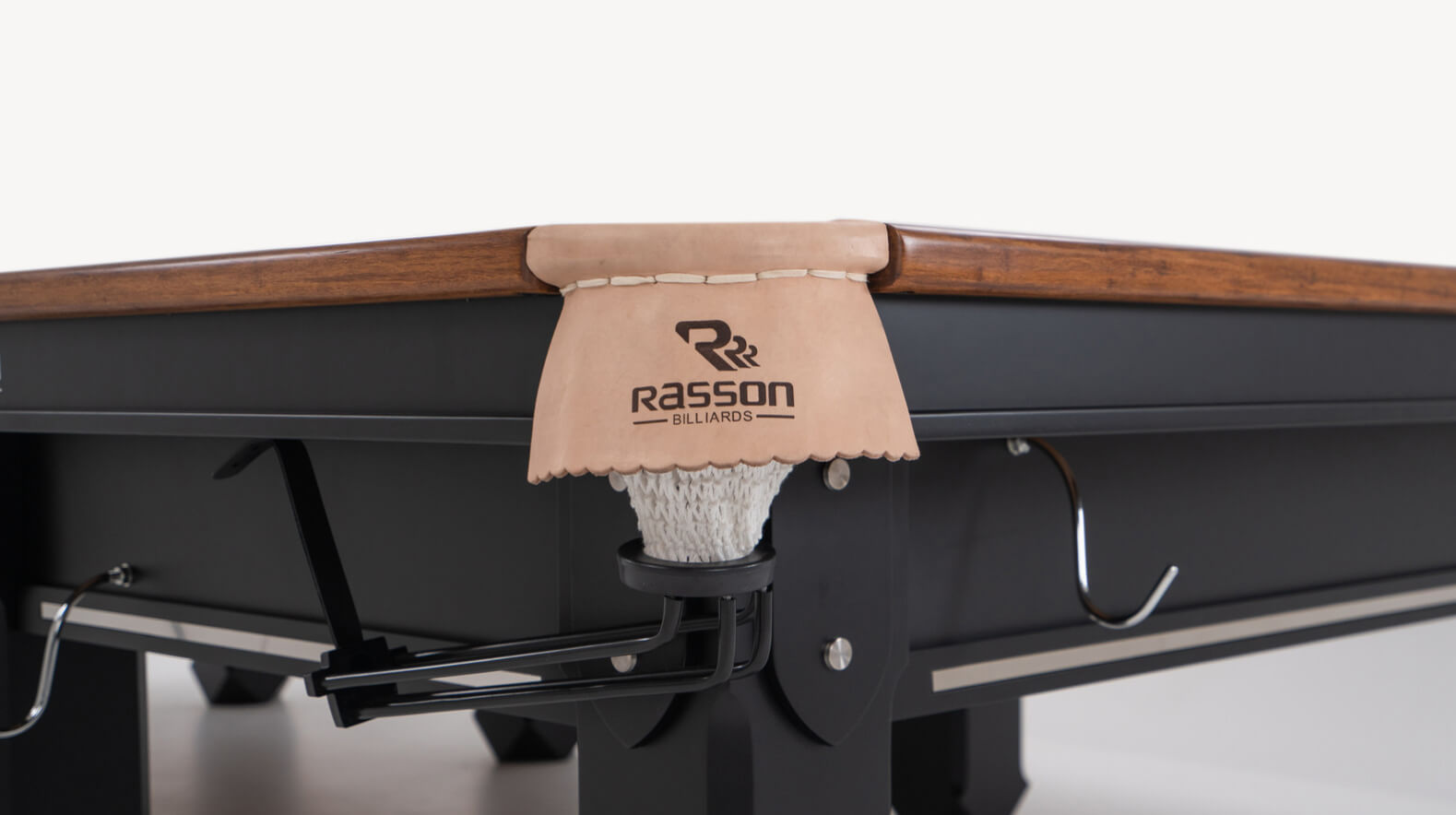 Прочные лузы из импортной кожи крупного рогатого скота с латунными уголками. Устройство луз предотвращает выпадение мячей.